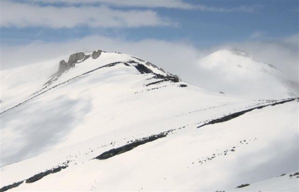 Cuando subimos a La Morala el otro día faltaba el Faquir, así que en el día de hoy Faquir, 'the esquiator man', acompañado del que suscribe (Navarro), se ha subido hasta este picacho... la imagen que ofrecía el cordal que une La Morala con el Pico Huevo es espectacular, con las nubes que entraban y salían. La 'chincheta' que se ve en medio fue objeto de otra ascensión en días anteriores, con una esquiada por una pala impresionante.