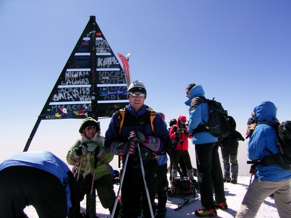 El martes (día 7 de abril), y sin madrugar nos lanzamos a subir con esquis el Toubkal, menos Roncha que jugaba a la contra (subió al día siguiente). De salida se forman distintos grupusculos y diferentes formas de ver las cosas, que si cuchillas, que si esquis a la chepa, yo prescindo de disquisiciones y tal cual para arriba. A medida que subo me quedo sólo y empieza a soplar un viento que te deja congelado findus. Para no enfriarme tiro para arriba con la esperanza de subir al Toubkal Oeste y a la bajada incorporarme al resto del pelotón. Sin embargo dicho pico no facilita su bajada con esquis para ir al Toubkal, por lo que decido continuar hasta la cima a la que llego despues de 2 h y 5 minutos de salir. Subiendo he visto la posible bajada directa desde el pico por su cara O y despues S ( por donde se sube no tiene nieve suficiente).