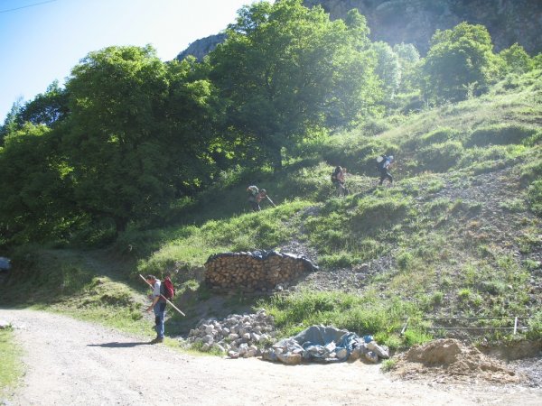 Como lo gordo ya estsaba en las majadas y la salida de Caín la hicimos tarde y hacía un sol de justicia (11:00H.), el objetivo de Jorge y Miche se convirtió en intentar remontar el material desde las majadas hasta la boca de la sima y bajar a dormir denuevo a Mueño. Pepiño dedicó la salida para subir su material, enzularlo en las proximidades de TC-1 y bajar a Caín. El tio Ronchona que tampoco se quedó a dormir aparte de ayudar en la subida hasta Mueño, se dedicó con el Animal a limpiar la única majada que queda en pié hasta que regresó Pepiño que comenzaron su descenso sobre las 6:00 de la tarde. El que subscribe: Javi (Animal) mientras esperaba a Jorge y a Michel terminó de adecentar el caseto hasta  las 21:00, hora en la que regresaron. Merecida cena al oscurecer y larga tertulia en una noche estupenda. El domingo 31, no sin mucho madrugar, Jorge, Michel y Animal bajamos a Caín donde después de los refrescantes campanos, buen almuerzo de sobras en el bar de Victor y cada oveja con su pareja.