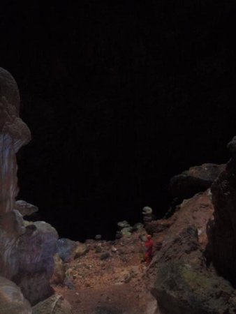 Todo sembrado de spits, un volao de 56 metros y llegamos a la sala de grandes dimensiones con grandes formaciones, donde es dificil perder las referencias gracias al haz de luz que entra por la boca.