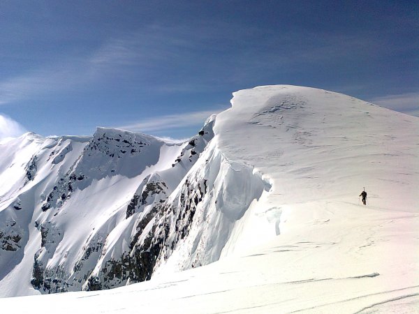 Calzamos los esquís en el alto del puerto y nos dirigimos hacia el Cubil, subiendo por su flanco norte. Una arista suave que no deja de tener 'su aquel' debido a su anchura (no mucha) y sus viseras hacia el circo que cierra con el Tres Provincias y el Peña Prieta. La arista se empina un poco llegando arriba. Una visera rota nos deja posarnos arriba sin ninguna complicación. Todo este tramo lo hicimos con esquís a la chepa por motivos evidentes.