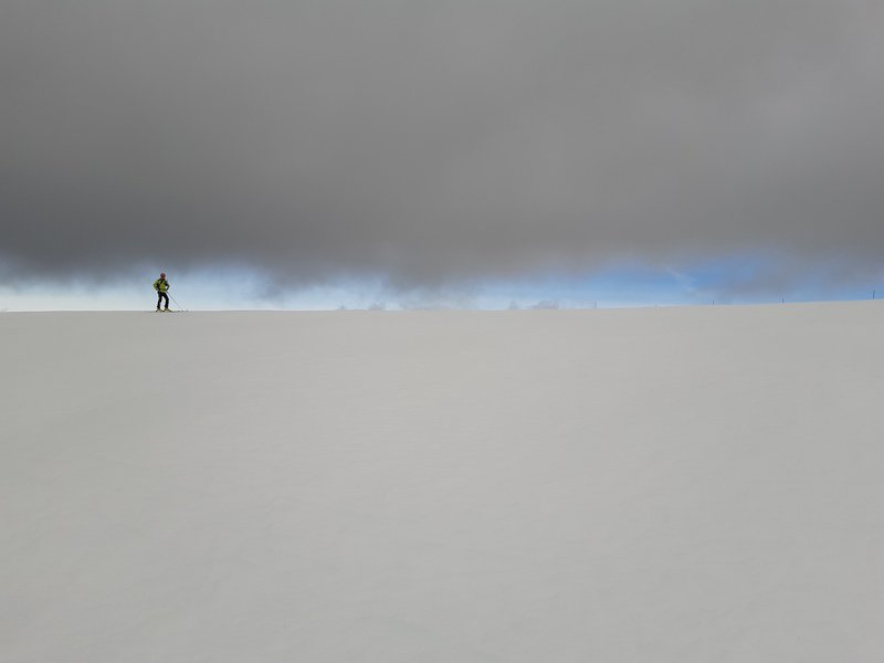 La nieve escasa pero apretada y de buena calidad para esquiar y hacer slalom entre las escobas.