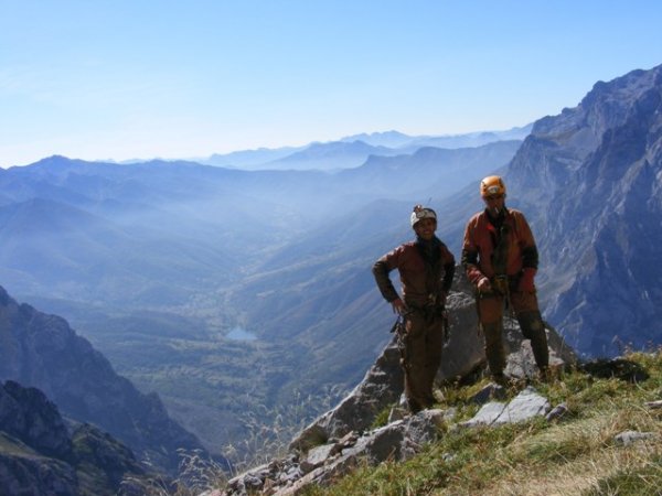 Pues bien, ya tenemos a Faquir y Anguio reinstalando la cabecera de 'La Collada' para que quedara 'de libro' y descienden camino del 'Sotano Uno'.